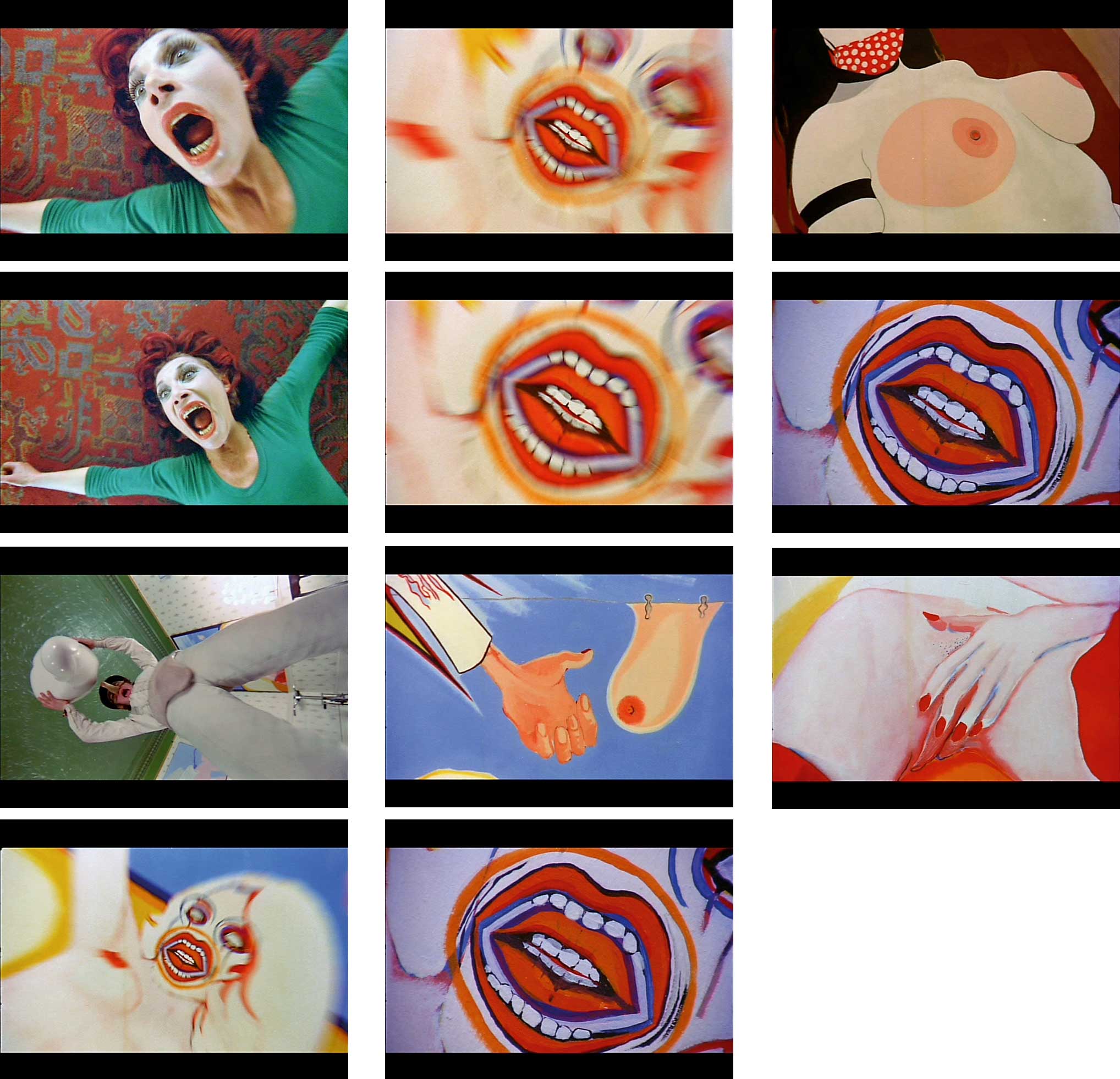 Kubrick costruisce la insostenibile tensione emotiva dello stupro, culminante con l'omicidio della "signora dei gatti", per sola virtà di montaggio: facendo cioè seguire alle immagini alternate della donna che urla, ripresa con una serie ripetuta di zooming a schiaffo, e di Alex che solleva il fallo-scultura per colpirla, una raffica di immagini di quadri di Pop-art di soli 2 o 3 fotogrammi, creando così una sequenza allucinatoria di montaggio le cui immagini, pur non chiaramente discernibili, s'imprimono comunque violentemente nella coscienza dello spettatore.