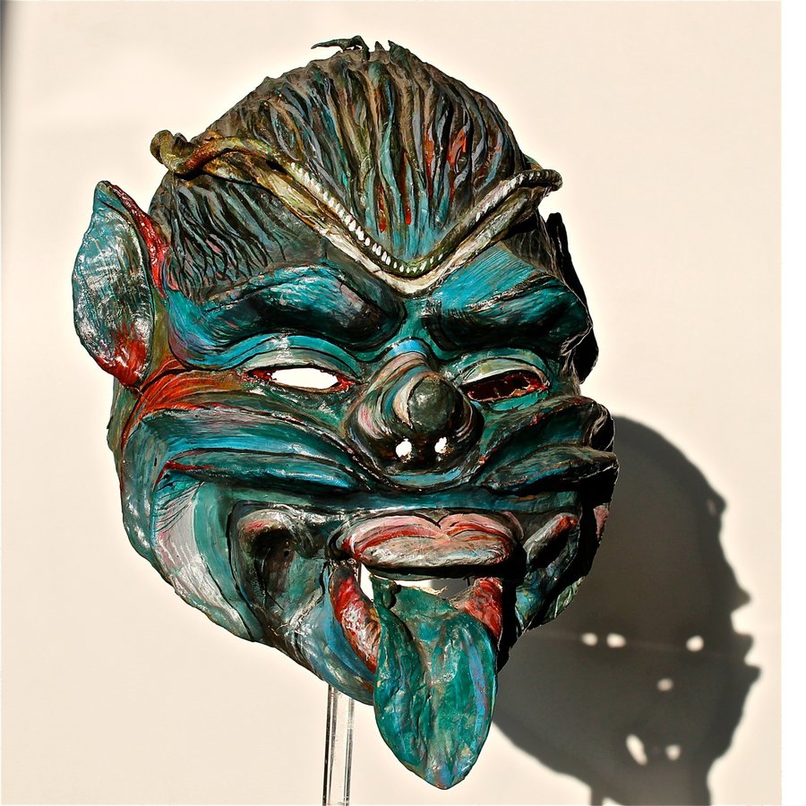 Maschera giullare con lingua, 1990, carta e stoffa. Realizzata da Ezio Flammia