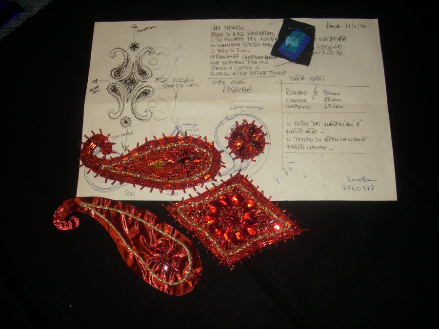 Ricamo con motivi cachemire realizzato della sig.ra Rosalba Menichelli su tessuto laminato con perline e cordoncini
