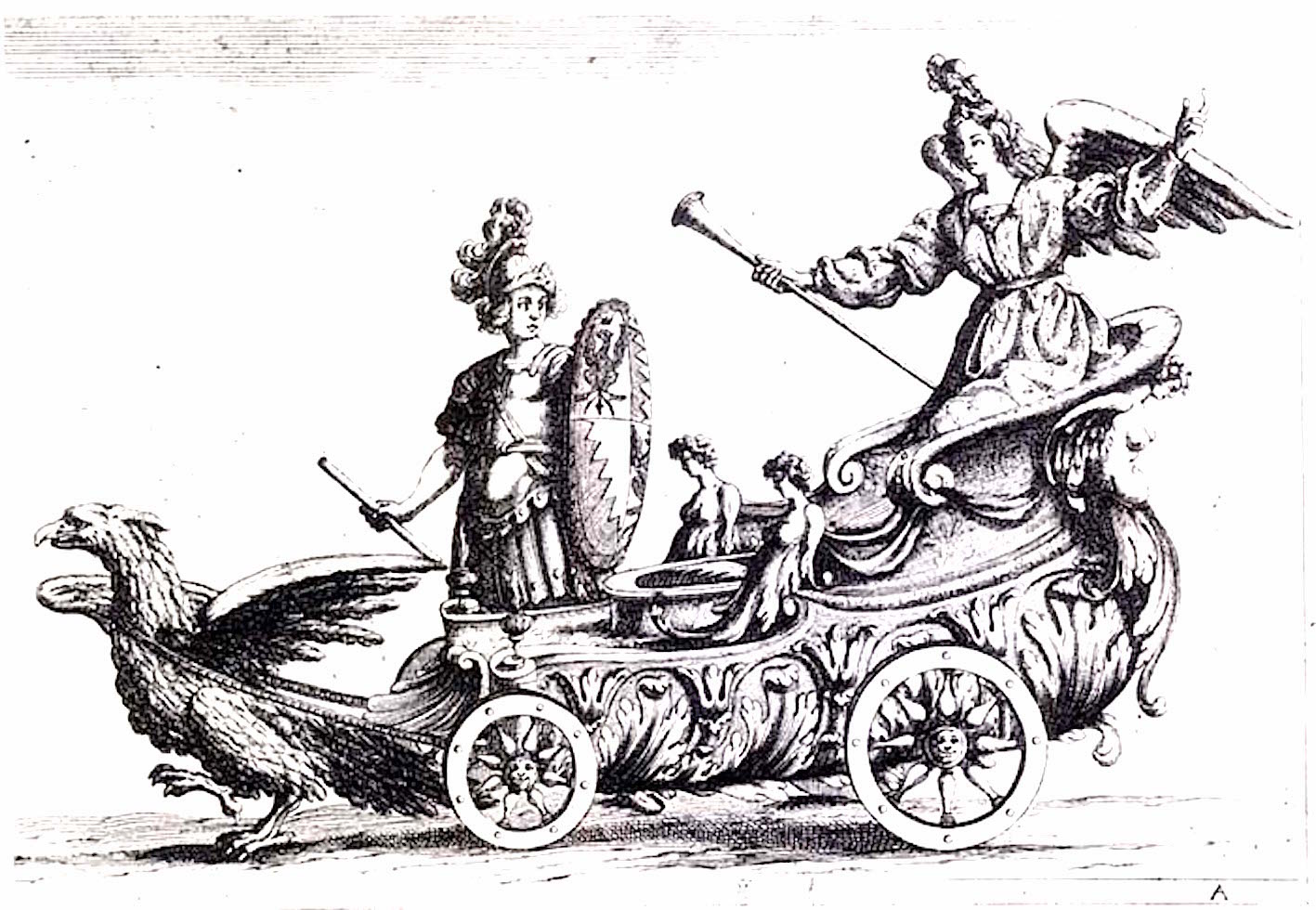 Un carro scenico per la Giostra del Saracino, tenutasi a Roma in Piazza Navona nel 1634. Progetto dello scenografo Francesco Guitti, incisione di Andrea Sacchi.