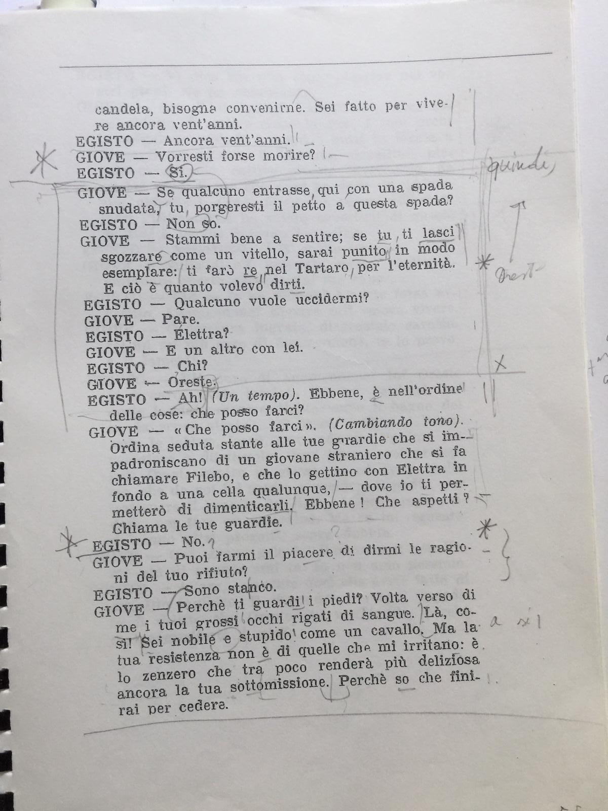 Pagina del copione Le mosche con gli appunti di Luca Ronconi