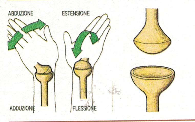 Articolazione a sella. Formata da due superfici articolari, una concava e una convessa. In questo caso si tratta dell’articolazione del polso, che può compiere flessione, estensione, abduzione e adduzione.