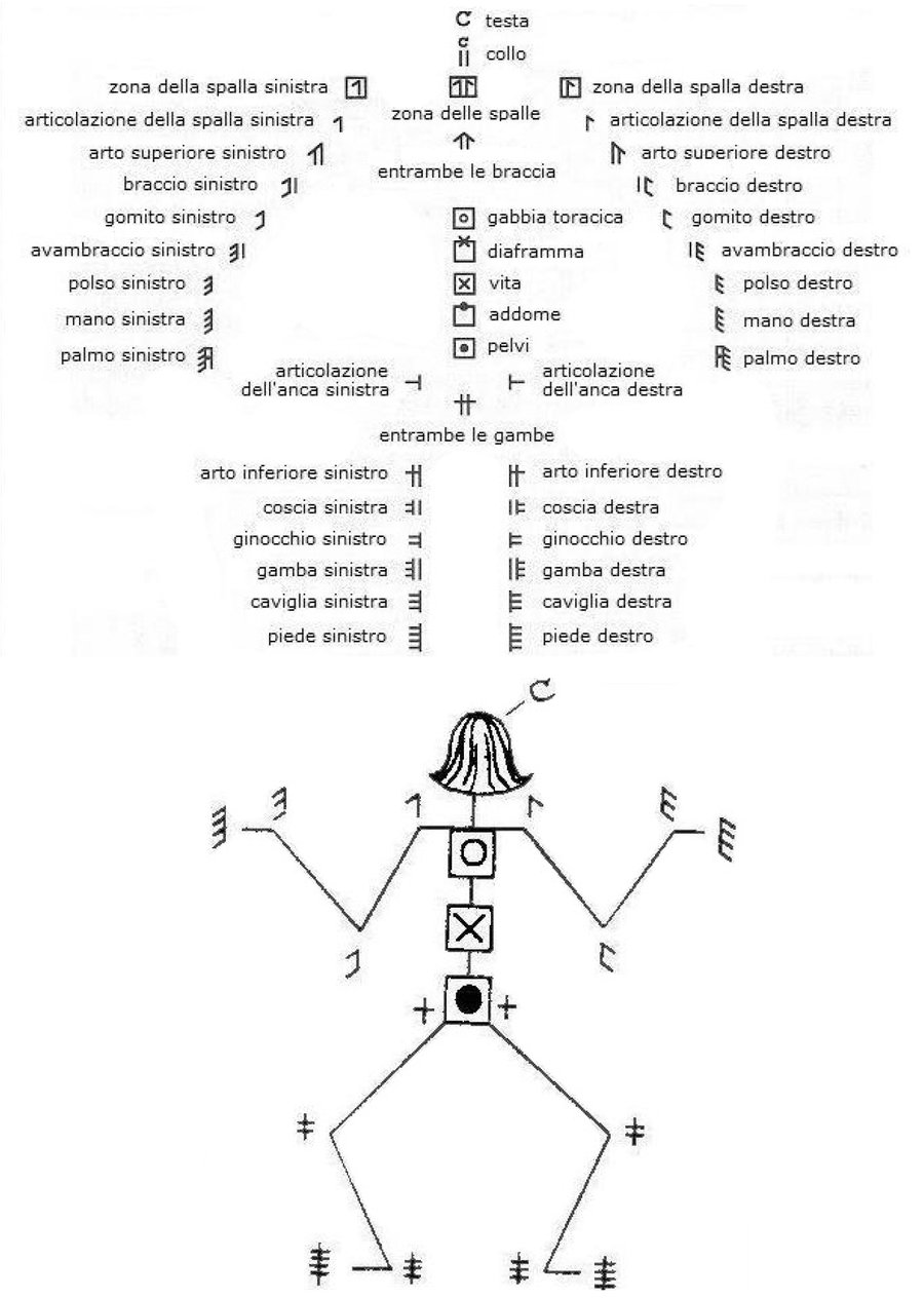 I simboli che indicano nello specifico ogni singola parte del corpo. Sopra: immagine elaborata da Demy Giustarini. Sotto: immagine tratta dal volume Labanotation di Ann Hutchinson Guest, terza edizione, Routledge, New York 1991, p. 500 (disegno di Doug Anderson).